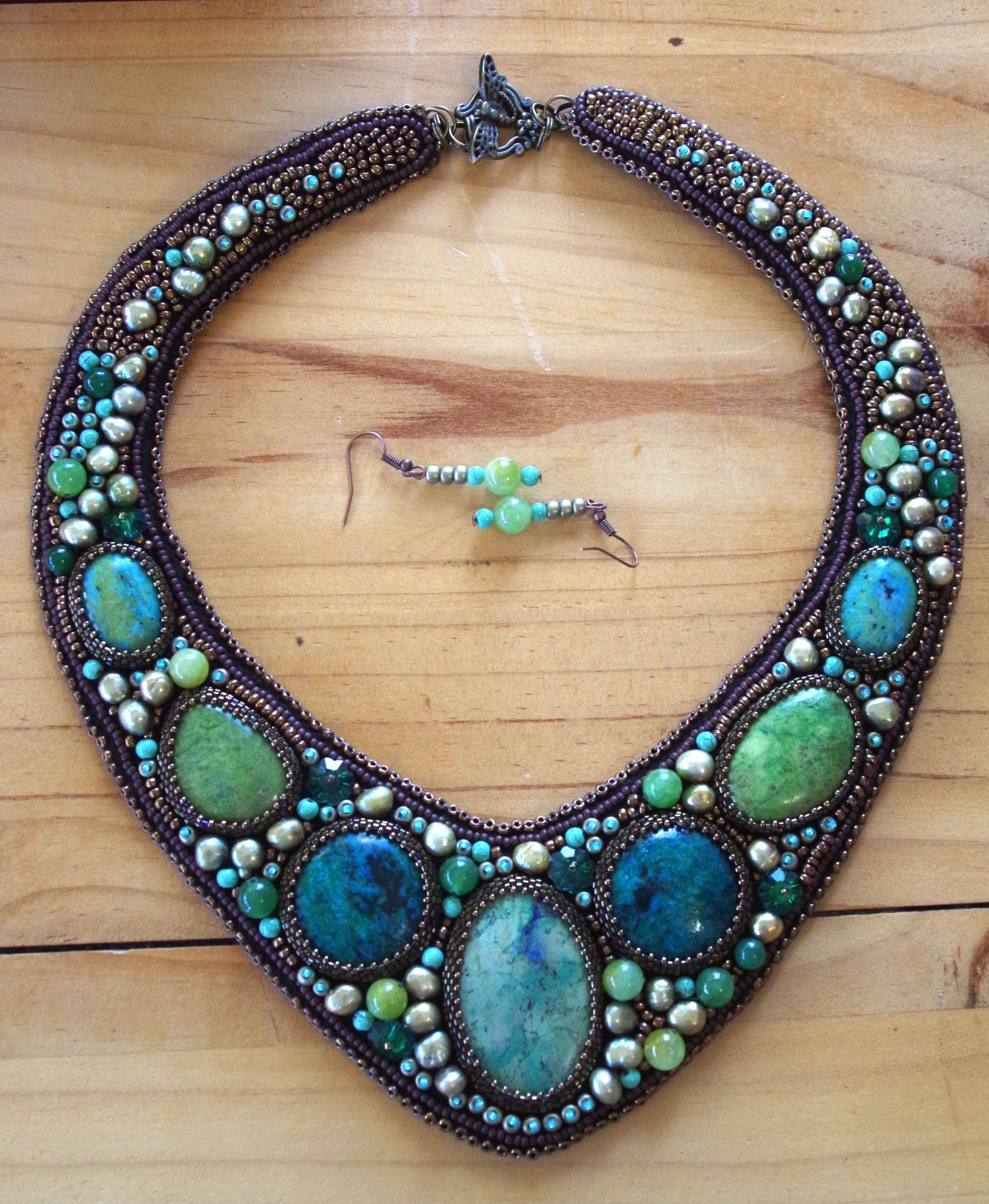 Another recent addition to my bead embroidery passion in the jewellery line. “Sea Foam” took quite some time to design and manufacture because there are no patterns in my work, only dreams and concepts I turn into reality. A variety of semi precious cabochons in this design including pale green Chrysocolla, dark green Chrysocolla, Sesame Jasper apple green Magnesite, Lemon Jade, Green Jade and Freshwater pearls. More Czech seed beads dotted throughout and highlighted here and there with jade green facetted glass cabochons for extra sparkle.